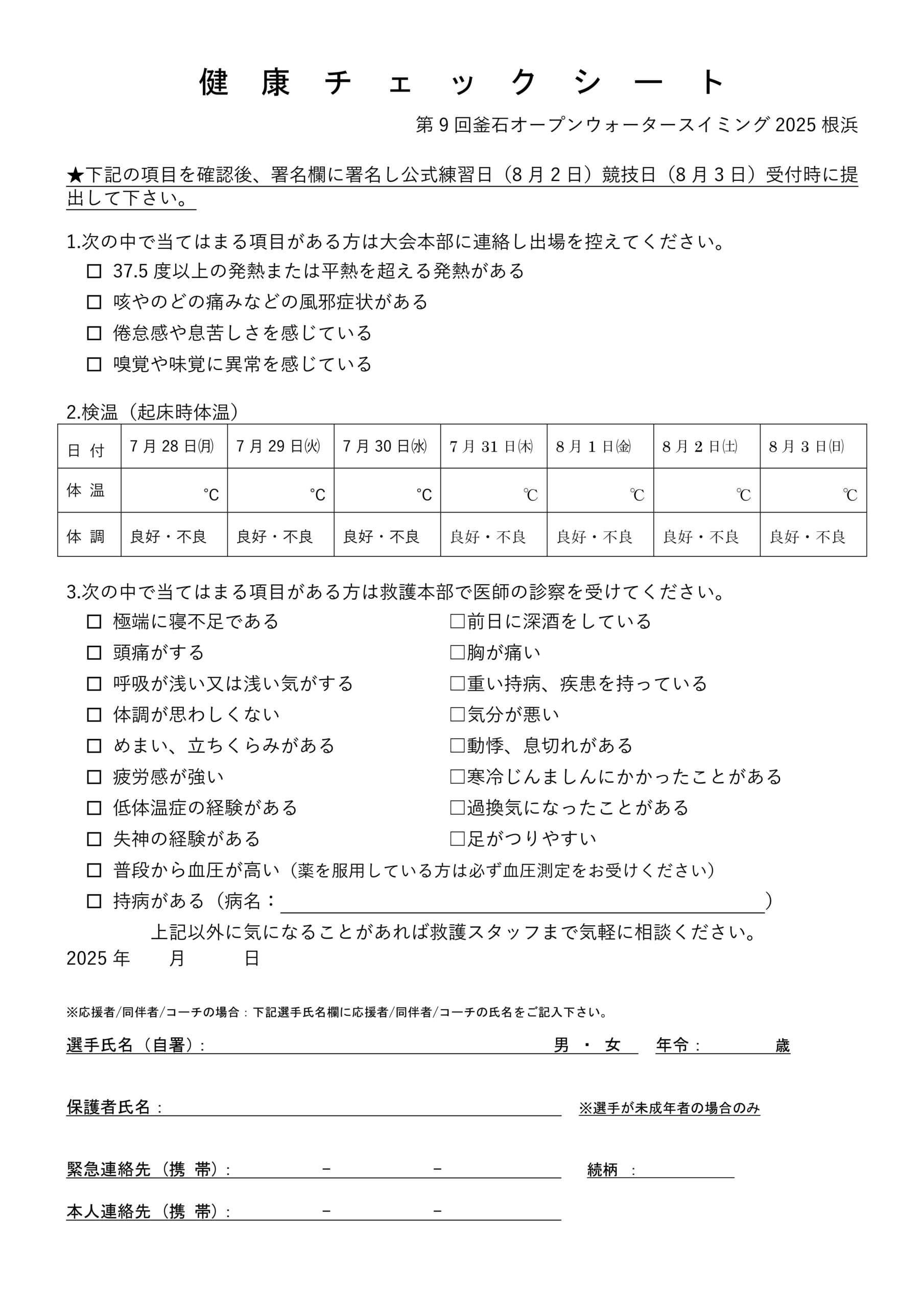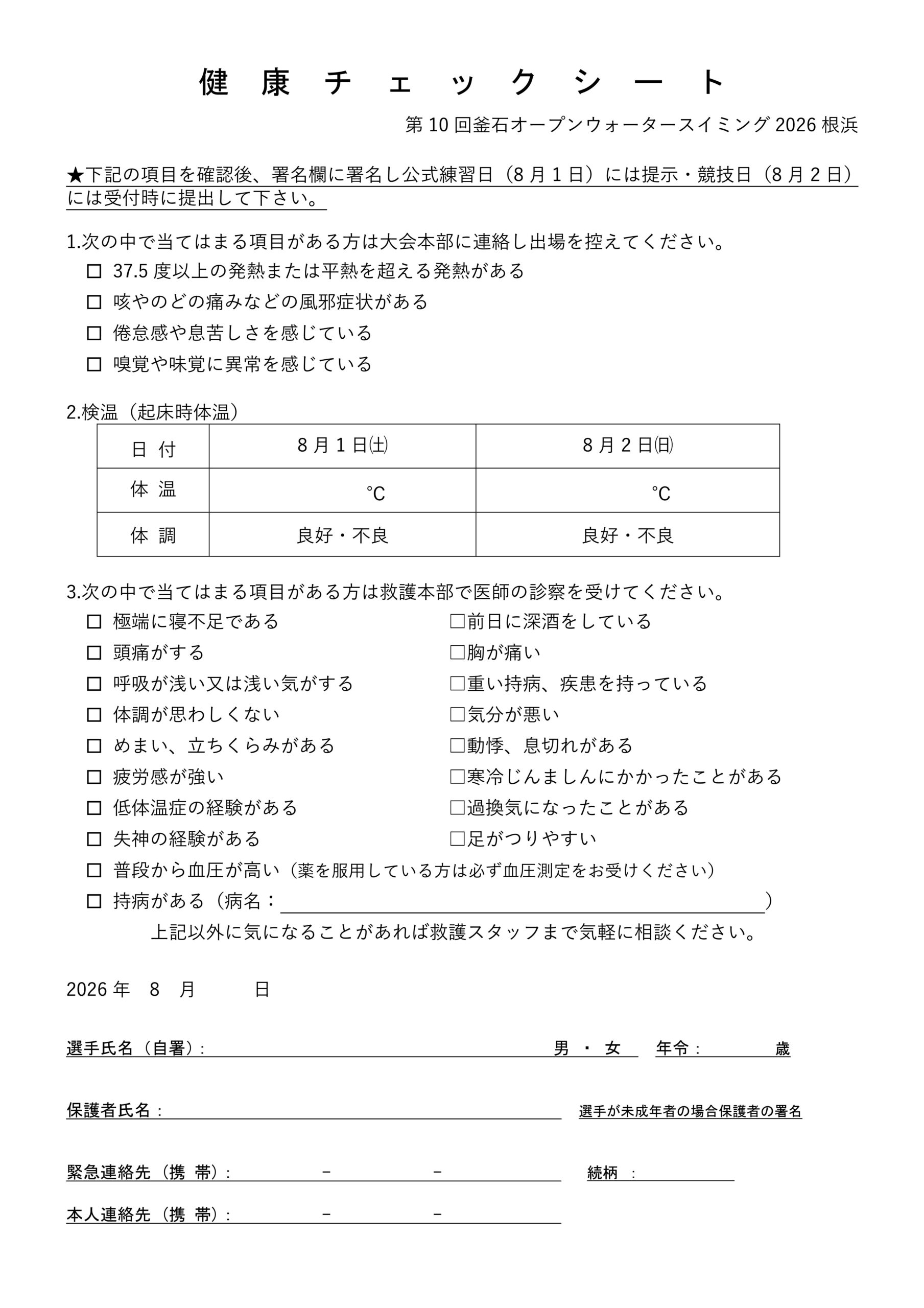 健康チェックシートはHPよりダウンロードの上、プリントアウト/記入しお持ちください。